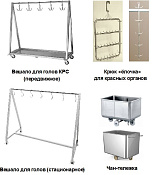 1) Вешало для голов КРС (передвижное) – конструкция, предназначенная для хранения, осмотра, обработки и транспортировки голов скота, а так же сбора крови и отработанной воды. Конструкция крюков, на которые подвешиваются головы, позволяет производить их внешний осмотр, промывку внешней и внутренней сторон, а так же отделение желез, языка и т.д. Специальный поддон предназначен для сбора отработанной воды и отходов производства, которые далее сливаются через специально предусмотренное в поддоне отверстие. Передвижение вешало между различными участками линии, осуществляется при помощи колес, оснащенных фиксатором.