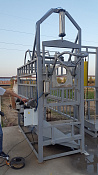 8) Площадка распиловки туш крупного рогатого скота - это подъёмно-опускная площадка, оснащённая платформой, которая с помощью электродвигателя с редуктором может подниматься и опускаться на требуемый уровень высоты. Так же, подъёмно-опускная площадка оснащена противовесом для более плавного и стабильного движения платформы. Управляет процессом работник, находящийся на платформе с помощью педалей, расположенных на полу площадки. Данная конструкция используется при распиловки туш на две симметричные половины (полутуши) для удобства их транспортировки, более быстрого охлаждения и замораживания, а так же эффективного использования холодильных площадей. Подъёмно-опускная площадка может так же использоваться для нутровки туш;