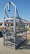1) Бокс убоя крупного рогатого скота (КРС) - устройство, представляющее из себя клетку, предназначенную для обеспечения удобства, ускорения и травмобезопасности процесса ритуального убоя крупного рогатого скота, за счет обездвиживания животного. Принцип действия. Животное загоняется в бокс через распашную дверь, расположенную в задней части устройства и с помощью толкателя подгона подталкивается к передней стенке. В передней стенке установлен механизм фиксации шеи, находящийся в открытом состоянии, при этом животное может просунуть в проём голову. В этот момент механизм фиксации шеи опускается и удерживает животное от каких-либо перемещений. Затем поднимается механизм подъёма и фиксации головы, удерживающий голову животного в задранном положении, предоставляя беспрепятственный доступ к горлу и позволяя работнику забойного цеха безопасным и оптимальным образом осуществить рез быстрым движением. После перерезания горла осуществляется процесс обескровливания по окончании которого тело опускается на подвижный пол бокса и соскальзывает на специальный поддон приёма туши КРС.