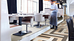 Effekta Professional от Forbo Flooring позволяет создавать комбинации из плиток, планок и ромбов, решая задачи зонирования пространства, выбирая необходимое цветовое решение и сочетание фактур дерева и камня.