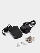 В комплект входит педаль, набор для шитья,блок питания и инструкция.
