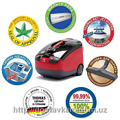 Thomas TWIN HELPER - это моющий пылесос с функцией очищения воздуха на 99.99%. Жить в большом городе в наше время - это жизнь в условиях постоянного экологического стресса, когда наше физическое и психическое здоровье испытывают огромные нагрузки от загрязнённости окружающей среды. В таких условиях значительно улучшить качество жизни Вам поможет моющий пылесос с аквафильтром Thomas Helper. Это не просто пылесос - это целая система по очистке и увлажнению воздуха в вашем доме. Аквафильтр для сухой уборки в пылесосе Thomas - это фильтрация всасываемого воздуха через воду с очисткой выходящего из пылесоса потока воздуха до невероятных 99.99%. Достаточно проводить сухую уборку с аквафильтром 1-2 раза в неделю - и Вы со своей семьёй начнёте жить в новой реальности: как будто вы не просто дома, а в девственно чистом лесу, где каждый квадратный сантиметр наполнен кислородом, где воздух насыщен ароматами леса и обогащён влагой. В этом случае ваши лёгкие скажут вам большое спасибо, ведь они узнают, как дышится чистым природным воздухом. Вкратце о самом пылесосе. СУХАЯ УБОРКА С АКВАФИЛЬТРОМ. При сухой уборке сбор мусора и пыли происходит в воду. Вы просто заливаете 1 литр воды в бачок перед уборкой, и также просто сливаете грязную воду в конце уборки. И все, больше ничего делать не нужно. Забудьте о фильтрах, об их очистке и замене, забудьте вообще о смене пылесоса на ближайшие 10 лет: система аквафильтра в пылесосах Томас является одной из самых надёжных и долговечных в мире. Кроме ковров, полов и мебели в вашем доме идеально чистой будет ещё и вся окружающая атмосфера. Чистый и увлажненный воздух в доме, как в лесу после дождя - это не просто красивые слова, а ваша новая реальность. Также пылесос можно использовать как отдельную установку по ароматерапии, увлажнению и очистке воздуха: для этого достаточно добавить в воду пару капелек ароматизатора или эфирного масла и включить пылесос без шланга. Скорость прокачки воздуха - 65 литров в секунду: это позволит полностью обновить воздух в одной комнате за 10-12 минут. Дополнительная паркетная насадка с щетинками из настоящего конского волоса бережно и аккуратно очищает паркет, глянцевый ламинат, натяжные потолки и дорогие фактурные обои без риска их поцарапать. Функция сбора жидкостей может оказаться очень полезной при экстренном сборе воды с любой поверхности в доме. Thomas может собрать до 4-х литров жидкости за один проход. ВЛАЖНАЯ/МОЮЩАЯ УБОРКА. Thomas завоевал доверие людей по всему миру качеством своей влажной уборки. Пылесос качественно промывает ковры, линолеум, паласы, ламинат, ковролан, мебель, кафель и даже окна. После влажной уборки ковры заиграют первоначальными красками, окна засияют от блеска, а на глянце кафеля Вы сможете ловить своё отражение. Такой результат достигается за счёт мощной подачи на поверхность тысяч мелких капелек из смеси воды и моющего средства под давлением в 1.5 бар. Параллельно подаче воды пылесос будет осуществлять всасывание жидкости и сушку поверхности. В итоге по завершению очистки ковёр, окно или кафель будут сухими на 99%. Сам процесс влажной уборки при этом настолько прост, что с этим справится даже подросток - мы Вам это гарантируем. • Страна производства: Германия • Мощность мотора: 1600 Ватт • Мощность всасывания: 420 аэроватт • Защита от перегрева: есть • Плавный запуск двигателя: есть