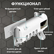 Держатель для обычных и электрических зубных щеток Smart UV - современный гаджет для вашей ванной комнаты, стерилизующий принадлежности от бактерий и микроорганизмов до 99,9%. Такая высокая степень защиты обеспечит защиту вашего здоровья от болезнетворных микробов, а также убережет щетки от лишней влаги.Товары дополнены подставкой под зубные пасты - экономичный выдавливатель поможет регулировать расход средства и поможет использовать пасту полностью.Аксессуары с ультрафиолетовым излучением позволяют проводить дезинфекцию не только щеток, но и бритвы.Настенный набор с прессом для зубной пасты включается очень просто - достаточно нажать на кнопку пуска при закрытой крышке, и диспенсер заработает автоматически. После 6 минут дозатор самостоятельно отключится - прибор не тратит лишнюю энергию и бережет заряд (питание акссесуаров в ванную идет через USB кабель).Приобретайте удобный и быстрый стерилизатор для вашего дома и поддерживайте чистоту ваших ванных принадлежностей каждый день!