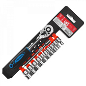 Наборы головок с трещоткой пригодятся когда требуется произвести работу по откручиванию или закручиванию гаек и болтов. Трещотка встроенная в рукоятку облегчает работу, т.к. не требуется переставлять головку, можно заворачивать и отворачивать гайки и болты возвратно-поступательными движениями. Также присутствует флажок реверса, и функция простой смены головки - кнопка на торце трещотки.