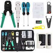 Набор сетевика включает в себя все самые необходимые инструменты: тестер, обжимной инструмент, нож для зачистки кабеля, инструмент для заделки кабеля, стриппер, отвертки, коннектор стандарта rj45.
