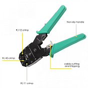 Обжимной инструмент предназначен для обжатия коннекторов стандартов RJ11, RJ12, RJ45 на кабеле категорий Cat5 и Cat5e (4P4C, 6P6C, 8P8C). Обеспечивает создание надежного и прочного соединения, при этом достигается большая точность и аккуратность создаваемого соединения, соседние проводники не будут затронуты. Рабочая часть обжимного инструмента выполнена из высококачественной стали, благодаря этому обжимной инструмент прослужит вам продолжительное время.