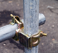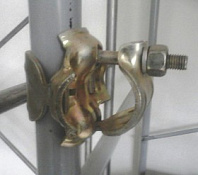 Обычный хомут для строительных лесов (крестовидная муфта) - предназначен для фиксации вертикальных и горизонтальных элементов между собой под углом 90 градусов, с помощью такого нехитрого приспособления появилась возможность создать в ручную без сварочных