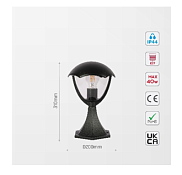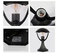 Улично-садовый светильник, черный, используется для освещения садовых аллей и дорожек. Корпус выполнен из алюминиевого сплава, который стоек к коррозии, и покрыт термостойкой краской. Светильник имеет погодозащитную конструкцию и может использоваться в широком диапазоне температур. Такой фонарь прост в установке и эксплуатации. Его можно эксплуатировать с лампами накаливания, энергосберегающими и светодиодными лампами.