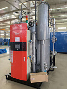 Южно-корейский стальной водотрубный паровой котел на 2000 кг вертикального исполнения работающий на газе или комбинированной горелке газ/дизель.. Котлы BOOSTER это произведение искусства инженерной мысли, они очень высокоэффективны! Все котлы поставляются исключительно с экономайзером, который позволяет экономить в год от 10 до 50 тыс $ в зависимости от мощности котла и графика работы. Конструкторы уменьшили массо-габаритные характеристики, снизили водяной объем и сократили время выхода на номинальные параметры до 5-10 мин, так же это позволяет устанавливать эти котлы прямо в производственных помещениях.
