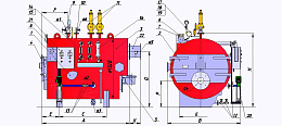а1- выход пара; а2 – подпитка; а3 –продувка, дренаж; а4 – горелочная плита; а5 – уходящие газы; а6 – пробоотборник . 1- корпус; 2 – крышка поворотной камеры; 3 – каркас с теплоизоляцией ;4-поворотная камера;5,6-люк осмотра;7-звонок;8-пульт управления;9,10,12-вентиль;11-предохранительный клапан;13-обратный клапан;14-указатель уровня;15-запорное устройство;16-уравнительная колонка;17-кран трехходовой;18-манометр;19-датчик давления;20-насос;21-шкаф электрический;22-клапан. Рабочее давление пара , МПа (кгс/см2) – 0,8 ( 8 ) Номинальная температура пара, °С - 175 DNа4 уточнить по горелке