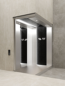Лифт модели **TLZ-E14**, произведенный на **Toshkent Lift Zavodi**, отличается стильным и футуристическим дизайном. Интерьер выполнен в сочетании черных текстурированных панелей и зеркальных поверхностей, что придает ему современный и элегантный вид.