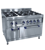 (предназначена для приготовления первых, вторых и третьих блюд в наплитной посуде, а также для жарки полуфабрикатов из мяса, рыбы, овощей и выпечке мелкоштучных кулинарных изделий. Плита имеет четыре горелки по 5,5 кВт и две мощные горелки «двойная корона» по 7,5 кВт. Плита снабжена системой автоподжига и устройством «газ-контроль». Внизу жарочный шкаф с одним противнем GN 2/1 и одной решеткой того же размера, изготовленные из нерж. стали. Рабочий диапазон температуры духовки 100-3000С, полная  мощность –45 кВт (ккал.), мощность жарочного шкафа-8кВт (ккал.), расход природного газа - 4,35м3/ч, габ.разм.- 1200x947x978 мм, полностью изготовлена из нержавеющей стали,  масса-160 кг)