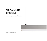Рассеиватель изготовлен из полипропилена и сохранит свои качества на протяжении всего срока службы. Степень защиты соответствует стандарту IP40, что подразумевает защиту от брызг. Светодиодный светильник подвесной можно установить в помещениях с влажностью выше среднего, но он должен быть вдали от источников влаги, во избежание попадания воды. В комплекте поставляются тросы для подвешивания светильника и два вида крепежей для закрепления тросов. Благодаря надежному драйверу светодиоды защищены от скачков напряжения, а равномерное свечение находится в диапазоне напряжения 165-265 В. Размер: 1200х50х70 мм.