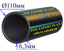 ООО «Pipeexportplant» предлагает полиэтиленовые трубы собственного производства: · полиэтиленовые трубы ПНД ПЭ100 SDR11- SDR26 диаметром 50мм-1200мм; · широкий ассортимент соединительных деталей для монтажа полиэтиленовых труб; Основным сырьем для производства полиэтиленовой трубы является PE-RT марки ПЭ100 производства Иран. Продукция, производимая из полиэтилена марки ПЭ100 является особо прочной, что подтверждается лабораторными анализами. Контроль качества выпускаемой продукции соответствует ISO 9001-2015, а также ГОСТ 18599-2001. Формы выпуска: в отрезках по 3, 6, 12 м в бухтах до 750 м (диаметром до 110мм)