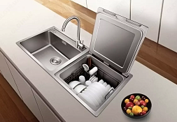 Посудомоечная машина 2-в-1 спроектирована таким образом, что легко поместится в раковине. Компактная конструкция состоит из самой машины и мойки, вертикально встраивается в обычную столешницу. Изготовлена из качественной нержавеющей стали, устойчива к царапинам, сколам, перепадам температуры и не подвержена коррозии. Машина оснащена плоской крышкой с сенсорной панелью управления и мощным распылителем, который эффективно удаляет остатки пищи, жир и пятна с посуды. Техника экономично расходует ресурсы, удобна в эксплуатации и не требует сложного ухода. Отлично справляется с загрузкой, рассчитанной на среднестатистическую семью.