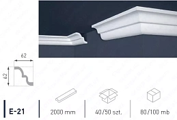 Потолочный плинтус ТМ Marbet (Польша) серии Lux модель Е-21 2 м (62 х 62 мм) изготовлен из экструдированного полистирола, удобного в применении материала, который имеет хорошую устойчивость воздействию влаги и не дает распространяться грибкам и плесени. Потолочный плинтус обеспечивает плавный переход от стен к потолку и, благодаря интересному привлекательному дизайну, дополняет интерьер помещения и придает потолку завершенность. Также он скрывает все неровности и дефекты, образуемые на стыке стены и потолка. Плинтус MARBET - это прекрасный декоративно-отделочный элемент для стен и потолков, позволяющий воссоздать классические интерьеры различных стилей, воплотить индивидуальные решения в декорировании, подчеркнуть эстетические достоинства помещения, а в некоторых случаях - скрыть небольшие погрешности внутренней отделки. Декоративные элементы MARBET позволят максимально достоверно воспроизвести ощущение роскоши и элегантности, добиться наполнения помещений атмосферой уюта и комфорта.