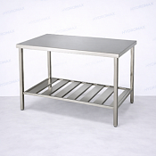 Стол изготовлен из высококачественной нержавеющей стали. устойчивой к влаге. коррозии и механическим нагрузкам. Нижняя решётчатая полка обеспечивает дополнительное место для хранения инвентаря. посуды или тары. не загромождая рабочую поверхность.