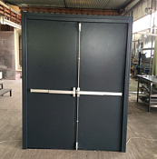 Дверь противопожарная, с пределом огнестойкости 60 или 30 минут. Полотно и коробка выполнены из цельногнутого листа стали, толщиной 0,9 мм для коробки и 0,5 для полотна. Ручка «антипаника», цвет – любой (7 стандартных бесплатно, нестандартные - за небольшую дополнительную оплату). Полотно и коробка заполнены каменной ватой высокой плотности (не слёживается). По периметру створок установлена терморасширяющаяся противопожарная лента – при нагревании свыше 400 градусов расширяется и герметизирует створку, не допуская распространение дыма и огня. Есть все необходимые сертификаты, одобрено Разрешением МЧС РУз для применения на территории РУз.