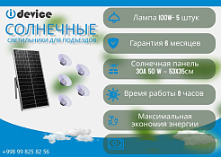 В комплект входит солнечная панель и 5 ламп мощностью 100 Вт.