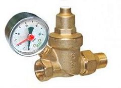 Редуктор давления с манометром, для систем холодного и горячего водоснабжения, латунный. Присоединение: НР-ВР Давление на выходе: от 1 до 6 бар Макс. давление на выходе: 16 бар Макс. рабочая температура: 75°C Рабочая среда: вода и воздух Предустановка: 3