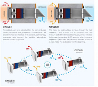 Рекуператор воздуха работает в режиме рекуперации тепла с двумя циклами. Два блока одновременно попеременно забирают и вытягивают воздух, обеспечивая сбалансированную вентиляцию. Это повышает комфорт в помещении и делает вентиляцию более эффективной. Тепло и влажность в помещении могут рекуперироваться во время проветривания, что снижает нагрузку на систему охлаждения летом.