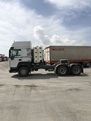 ■ Описание: трехосный (2 моста сзади) седельный тягач, двигатель на газовом топливе, пневматическая подвеска задних осей; предназначен для междугородних грузоперевозок ■ Колесная формула: 6x4 (трехосное шасси, две задние оси ведущие) ■ Нагрузка на седло: 15200 кг (макс.18000 кг) ■ Снаряженная масса тягача: 10800 кг ■ Разрешенная полная масса тягача: 26000 кг ■ Полная масса автопоезда: 44000÷65000 кг ■ Грузоподъемность автопоезда: 27000÷45000 кг, в зависимости от типа полуприцепа ■ Колесная база: 3825+1350 мм ■ Габаритные размеры (ДхШхВ): 7470х2500х3780 мм ■ Высота седла от земли: 1200÷1230 мм ■ Седельно-сцепное устройство: 2 дюймовый (50 мм) ■ Кабина: V7X - длинная и широкая, высокая крыша, двухместная, две спальных мест, подвеска кабины пневматическая, сиденья водителя на пневмоподвеске, кондиционер, магнитола с монитором ■ Модель двигателя: Sinotruk T12.42-50, 6-цилиндровый газовый, Euro 5 ■ Мощность двигателя: 420 л.с. ■ Крутящий момент: 1820 Н·м ■ Рабочий объем двигателя: 11,596 л ■ Система подачи газа: EControll с электронным управлением ■ Вид топлива: сжатий природный газ (CNG), метан ■ Коробка передач: Sinotruk HW19712, механическая 12-ступенчатая ■ Передняя ось и подвеска: VGD71, рессорная подвеска ■ Задние ведущие оси и подвеска: MCJ13JGY с гипоидними передачами, пневмоподвеска ■ Тормозная система: 2-контурная пневматическая, ABS, моторный тормоз, колесные тормозы барабанные ■ Газовые баллоны: 8х150 л ■ Расход газа: 38 куб.м/100 км, запас хода 550÷580 км ■ Шины: 315/70R22.5 бескамерные, 18PR, 10+1 шт.