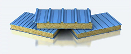 Сэндвич панели стеновые трехслойные со стенками из оцинкованной стали с полимерным покрытием шириной 1220\1200мм , толщиной от 030 мм до 050 мм с cердечником из теплоизоляционных плит на базальтовой , минеральной и полистирольной основе толщиной от 50 мм до 150мм. Марка СпСт50-030-030-ППС-14.