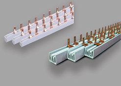 Шины соединительные производятся в двух исполнениях: FORK ("вилка") и PIN ("гребенка") на номинальные токи 63 и 100 А, на одно-, двух-, трех- и четырехфазную нагрузку. Шины соединительные представляют собой пластины выполненные из меди (шины на 100А - из луженой меди), закрепленные в корпусе из диэлектрического материала, не поддер-живающего горения и выпускаются стандартной длиной 1 метр (54 модуля по 18 мм или 36-37 модулей по 27мм). Шины с шагом 18 мм используются для коммутации большинства модульного оборудования шириной кратно 1 модулю. Шины с шагом 27 мм используются с модульным оборудованием шириной кратно 1.5 модуля (автоматические выключатели ВА 47-100, ВА 47-125).