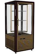 Холодильник для тортов, пирожных и других кондитерских изделий, с четырехсторонним остеклением позволит представить ваши десерты с любой стороны. Приятное сочетание золотисто-коричневых оттенков гармонично впишется в любой "тёплый интерьер". Шкаф оснащён двумя полками-решетками, которые можно устанавливать на разные уровни.