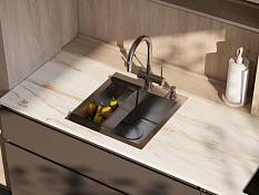 Смеситель имеет возможность подключения фильтра для чистой воды, что делает его особенно удобным для кухни. Гибкая подводка в оплетке из нержавеющей стали гарантирует долговечность и надежность эксплуатации.