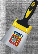 Шпатель 100 мм, нержавеющий металл, пластиковая рукоятка, используется для нанесения и выравнивания строительной смеси при малярных и строительных работах.