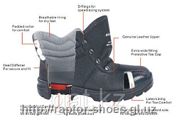 Верх обуви выполнен из натуральной кожи высокого качества. Комбинированная двухслойная подошва спецобуви (полиуретан/полиуретан) защищает от воздействия масел, нефтепродуктов, растворов кислот и щелочей, хорошо амортизирует и не утяжеляет обувь. Металлический подносок защищает переднюю часть стопы от механических воздействий (ударная прочность — 200 Дж).