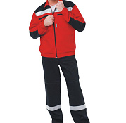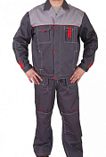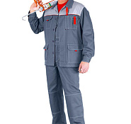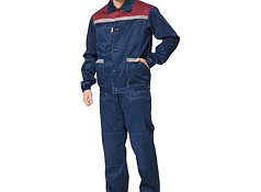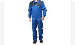 Куртка, полукомбинезон. Куртка укороченная с притачным поясом на резинке по бокам, центральной застежкой на 5 пуговиц, отложным воротником, кокетками спинки и полочек, с верхними накладными карманами(с клапанами василькового цвета) и нижними накладными карманами. Рукава с манжетами, застегивающимися на пуговицу и петлю. Полукомбинезон с застёжкой гульфика на пуговицы, накладными карманами, регулируемыми бретелями и эластичной тесьмой по линии талии спинки. Спецодежда мужская рабочая.