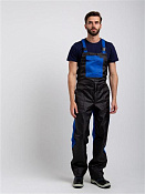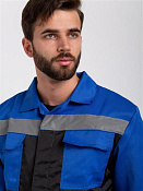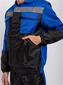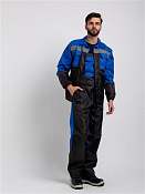 Костюм мужской, состоит из укороченной куртки и полукомбинезона. Куртка прямого силуэта, с притачным поясом , по бокам на резинке. Левый и правый концы пояса застегиваются на обметанную петлю и пуговицу. Полочка состоит из основной детали и отрезной кокетки контрастного цвета. На куртке два боковых накладных кармана с наклонным входом, выходящим из бокового шва, два накладных нагрудных кармана с клапанами, застегивающимися на контактную ленту. Воротник втачной отложной. Полукомбинезон с застежкой гульф, с регулирующимися бретелями. По верхним частям передних половинок расположены боковые накладные карманы с наклонным входом. На верхней части нагрудный накладной карман с клапаном, застегивающийся на контактную ленту, с дополнительным отделение под инвентарь. В области талии настрочена резинка. Состав: полиэфирнохлопковая (80% полиэстер, 20% хлопок) + оксфорд (100% полиэстер). Спецодежда мужская рабочая.