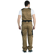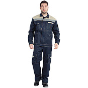 Куртка, полукомбинезон. Куртка укороченная с притачным поясом на резинке по бокам, центральной застежкой на 5 пуговиц, отложным воротником, кокетками спинки и полочек, с верхними накладными карманами(с клапанами василькового цвета) и нижними накладными карманами. Рукава с манжетами, застегивающимися на пуговицу и петлю. Полукомбинезон с застёжкой гульфика на пуговицы, накладными карманами, регулируемыми бретелями и эластичной тесьмой по линии талии спинки. Спецодежда мужская рабочая.