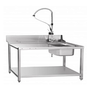 Стол предмоечный СПМП-7-4 предназначен для предварительного ополаскивания грязной посуды перед загрузкой в туннельную посудомоечную машину МПТ. В конструкцию вварена мойка и установлено душирующее устройство. Длина составляет 1300 мм. Путем несложного монтажа, с помощью верхнего зацепа и нижних винтов, крепится к посудомоечной машине. Каркас изготовлен из квадратной трубы. У стола имеется пристенный бортик, а ножки с резиновыми вставками регулируются по высоте. изготовлен из нержавеющей стали.