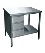 В столе друг над другом расположены три выдвижных ящика. Все детали изготовлены из нержавеющей стали. Для удобства использования ножки с резиновыми вставками регулируются по высоте. Допускаемая нагрузка на столешницу:100 кг Допускаемая нагрузка на нижнюю полку:19 кг Допускаемая нагрузка на один ящик:5 кг Количество ящиков: 3 шт. Габаритные размеры ящика (рабочие):300х520х150 мм Габаритные размеры:1000х700х860 ммМасса:60 кг