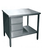 В столе друг над другом расположены три выдвижных ящика. Все детали изготовлены из нержавеющей стали. Для удобства использования ножки с резиновыми вставками регулируются по высоте. Допускаемая нагрузка на столешницу:100 кг Допускаемая нагрузка на нижнюю полку:26 кг Допускаемая нагрузка на один ящик:5 кг Количество ящиков: 3 шт. Габаритные размеры ящика (рабочие):300х520х150 мм Габаритные размеры:1200х700х860 ммМасса:65 кг