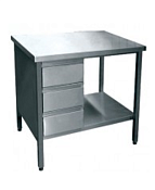 В столе друг над другом расположены три выдвижных ящика. Все детали изготовлены из нержавеющей стали. Для удобства использования ножки с резиновыми вставками регулируются по высоте. Допускаемая нагрузка на столешницу:100 кг Допускаемая нагрузка на нижнюю полку:36 кг Допускаемая нагрузка на один ящик:5 кг Количество ящиков: 3 шт. Габаритные размеры ящика (рабочие):300х520х150 мм Габаритные размеры:1500х700х860 ммМасса:70 кг