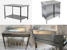 Столы могут быть выполнены с пристенным бортом из нержавеющей стали, с полкой и без полки. Каркас стола может быть выполнен из пищевой нержавеющей стали или технической нержавеющей стали.