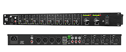 3) 4 микрофонных / линейных симметричных входа и 4 стерео AUX входа имеют независимое управление громкостью и тоном; уровень громкости интернет-сигнала регулируется;