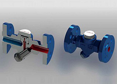 В основу работы термодинамических конденсатоотводчиков положен принцип действия в разнице скорости прохождения пара и конденсата в зазоре между диском и седлом. При прохождении конденсата из-за низкой скорости диск поднимается и пропускает конденсат. При поступлении пара в конденсатоотводчик, скорость увеличивается, статическое давление под диском падает, и диск опускается на седло. Пар, который находится над диском, благодаря большей площади контакта удерживает диск в закрытом положении. По мере конденсации пара давление над диском снижается, и диск снова поднимается, пропуская конденсат. Термодинамический конденсатоотводчик есть самым низкоэффективным из всех. Теромдинамический конденсатоотводчик может быть применен для дренажа паропроводов вне помещений, в тех случаях когда возврат конденсата не осуществляется.