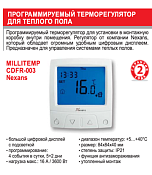 Термостат для регулирования электрических нагревательных кабелей, температурный диапазон от +5 до +40ºС (значения по умолчанию ).Термостат Millitemp можно запрограммировать и регулировать температуру воздуха или пола автоматически. Термостат может работать в двух режимах: постоянной или программируемой температуры. По умолчанию термостат Millitemp будет работать в режиме постоянной температуры с датчиком воздуха (встроенным в термостат датчиком).Температура устанавливается непосредственно пользователем термостата в соответствии с индивидуальными потребностями.