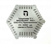 Толщиномер-гребенка ПРОМТ ТГ-1 — универсальный прибор для измерения толщины неотвердевшего (мокрого) слоя ЛКП на плоских и радиусных поверхностях в диапазоне 25-3000 мкм в соответствии с ISO 2808.