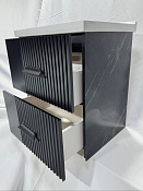 Напольная тумба из коллекции OSSO CERAMICS выполнена в современном дизайне и станет стильным дополнением интерьера ванной комнаты. Изготовлена из влагостойкого мебельного материал PVC, поверхность фасада и корпус имитируют фактуру натурального камня в глубоком графитовом цвете. Тумба устанавливается на ножки, состоит из высокого шкафчика и вместительных выдвижных ящиков. Укомплектована раковиной из качественной сантехнической керамики белоснежного цвета.