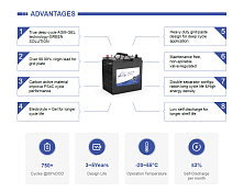 Основные характеристики: промышленная тяговая свинцово-кислотная батарея по технологии AGM+гель (Deep Cycle), предназначена для использования в спецтехнике. Применяются где нужна интенсивная работа в глубоком цикле разряда, с минимальными требованиями к обслуживанию, особенно где имеются экологические требования.