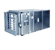 AHU1 (Air handling unit) – приточная установка от 1000 м3/ч до 100 000 м3/ч. Корпус из аллюминевого профиля и панелей из оцинкованной стали с теплоизолирующим элементами в виде пенопалестерола толщиной 25 мм. Вентилятор малогабаритный, бесшумный, с двухсторонним всасывание воздуха №1- №5. Нагреватели/охладители: медные, аллюминевые. Способо охлаждения водяной и фреоновый. Для очистки воздуха применяются матерчатые фильтры 1 ступени - панельные, 2 ступени - карманные. Для охлаждения и увеличения влажности воздуха применяются сотовые увлажнители. Для регулировки потока воздуха установлены клапаны с электроприводом и система противозамерзания. Автоматика безопасности и управление в притчной установке эелектронно дистанционное.