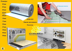 IZOBUBBLE ППИ-ПЛ- Вспененный пенополиэтилен, ламинированный лавсановой пленкой со стойким металлизированным покрытием (с одной или с двух сторон). Отличается высокой химической стойкостью к строительным материалам (бетон, цемент, известь, гипс), применяется как отражающая изоляция под систему теплый пол (электрические, водяные).
