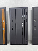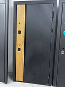 Современная входная металлическая дверь в строгом минималистичном стиле. Внешняя сторона выполнена в тёмном цвете с вертикальной текстурой, внутренняя — светлая панель. Подходит для квартир и частных домов.