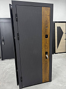 Современная входная металлическая дверь с комбинированным дизайном: тёмная вертикальная текстура в сочетании с декоративной вставкой под дерево снаружи и светлая панель внутри. Подходит для квартир и частных домов.